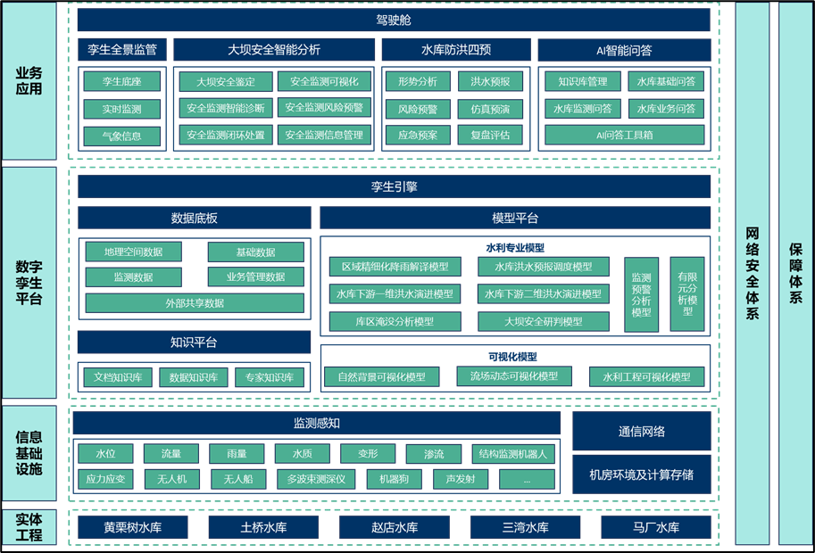 《方案》以黃栗樹等五座水庫(kù)為核心對(duì)象,進(jìn)行了前瞻性的信息化總體設(shè)計(jì)。旨在通過(guò)引入先進(jìn)信息技術(shù),構(gòu)建覆蓋水庫(kù)運(yùn)行管理全生命周期的智能化體系。該體系以實(shí)現(xiàn)對(duì)水雨情、工情、供用水、水質(zhì)及安全狀況等關(guān)鍵要素的精準(zhǔn)感知、動(dòng)態(tài)監(jiān)測(cè)、智能分析與高效決策為核心目標(biāo),全面提升水庫(kù)在科學(xué)調(diào)度、風(fēng)險(xiǎn)防控、管理效能與服務(wù)保障方面的綜合能力。主要建設(shè)內(nèi)容涵蓋智慧業(yè)務(wù)應(yīng)用、數(shù)字孿生平臺(tái)、信息基礎(chǔ)設(shè)施及網(wǎng)絡(luò)安全體系,共同構(gòu)成層次清晰、協(xié)同聯(lián)動(dòng)、安全可靠的現(xiàn)代化水利信息化總體框架,為區(qū)域水安全與可持續(xù)發(fā)展奠定堅(jiān)實(shí)的數(shù)字基石。